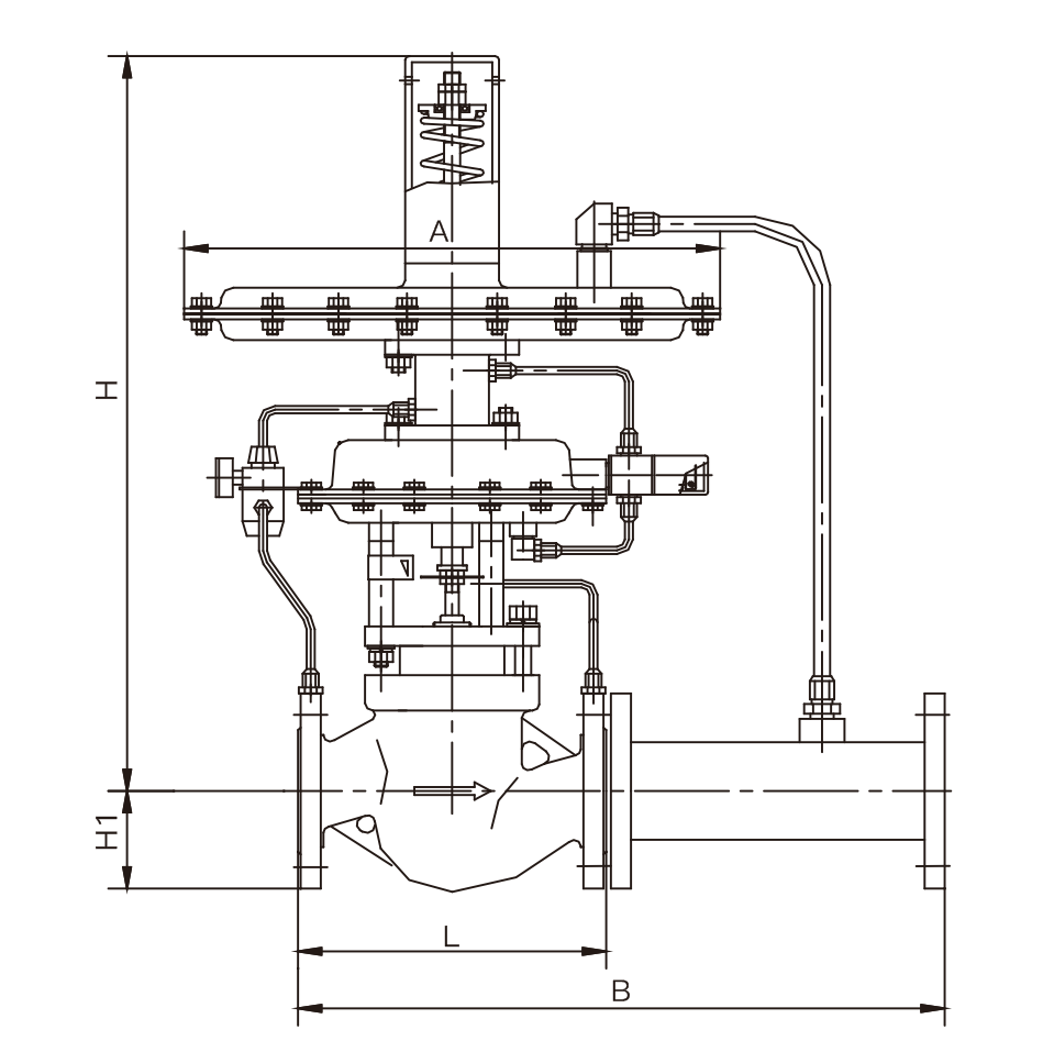 自力式帶指揮器壓力調(diào)節(jié)閥(即氮封裝置)主要用于儲罐頂部氮氣壓力恒定控制,自力式氮封閥是一種無須外來能源,以彈簧為動力核心利用被調(diào)介質(zhì)自身的壓力來控制閥芯位置變化,達(dá)到自動調(diào)節(jié)和穩(wěn)定壓力的目的,以保護(hù)罐內(nèi)物料不被氮化及儲罐的安全。該閥由ZZYVP快速泄放閥及ZZV自力式微壓調(diào)節(jié)閥兩大部分組成。快速泄放閥由壓力控制器及ZMQ-16K型單座切斷閥組成。