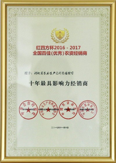 本網訊 近日,由中華合作時報、中國農業生產資料流通協會、中國東盟農資商會、中國農資傳媒主辦的“紅四方杯2016-2017全國百佳(優秀)農資經銷商”評選活動結果揭曉,按照公開、公平、公正的原則,經全國部分重點化肥生產企業、各級行業協會推薦、自薦、網絡投票、報紙投票、專家評審、媒體公示等程序,我公司成功當選為“十年最具影響力經銷商”。