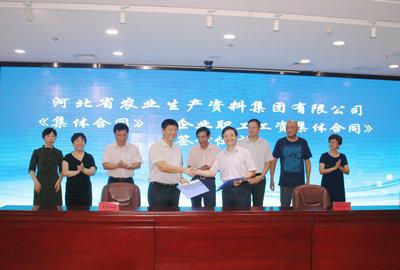 本網訊    8月2日上午,集團公司在農資大廈第一會議室舉行《集體合同》、《工資集體合同》簽訂儀式,企業方與職工方協商代表、監督檢查小組成員、勞動爭議調解委員會成員、集團公司職工代表出席。雙方首席代表,集團公司董事長、總經理李平現,集團公司工會主席鄭占山分別代表企業方和職工方在《集體合同》、《工資集體合同》文本上簽字。集團公司黨委副書記彭國江主持。