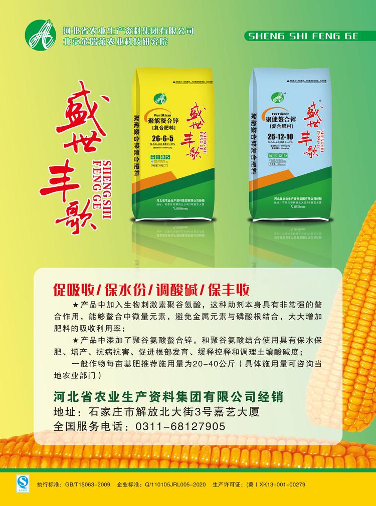 “盛世豐歌”牌聚能鰲合鋅肥是河北省農(nóng)資集團(tuán)依托華中農(nóng)業(yè)大學(xué)專利技術(shù),開(kāi)發(fā)、研制的新一代資源節(jié)約型和環(huán)境友好型的生物高聚能型改良產(chǎn)品,該產(chǎn)品是根據(jù)河北廣大地區(qū)的土壤狀況結(jié)合玉米全生長(zhǎng)期的營(yíng)養(yǎng)需求,對(duì)大量元素進(jìn)行科學(xué)配比的基礎(chǔ)上,以純生物聚能營(yíng)養(yǎng)劑-聚谷氨酸為核心增效動(dòng)能,特別融入玉米生長(zhǎng)所必需的生態(tài)螯合鋅和螯合鎂,通過(guò)高科技納米技術(shù)和智能調(diào)控手段,經(jīng)高塔工藝精制而成,為作物生長(zhǎng)的各個(gè)階段提供充足的營(yíng)養(yǎng),同時(shí)還有效避免了無(wú)效養(yǎng)分的囤積和浪費(fèi)。