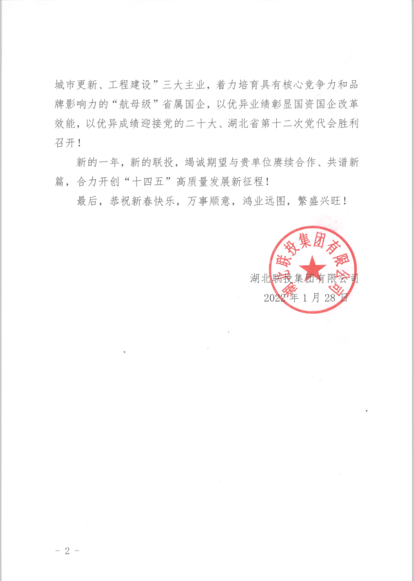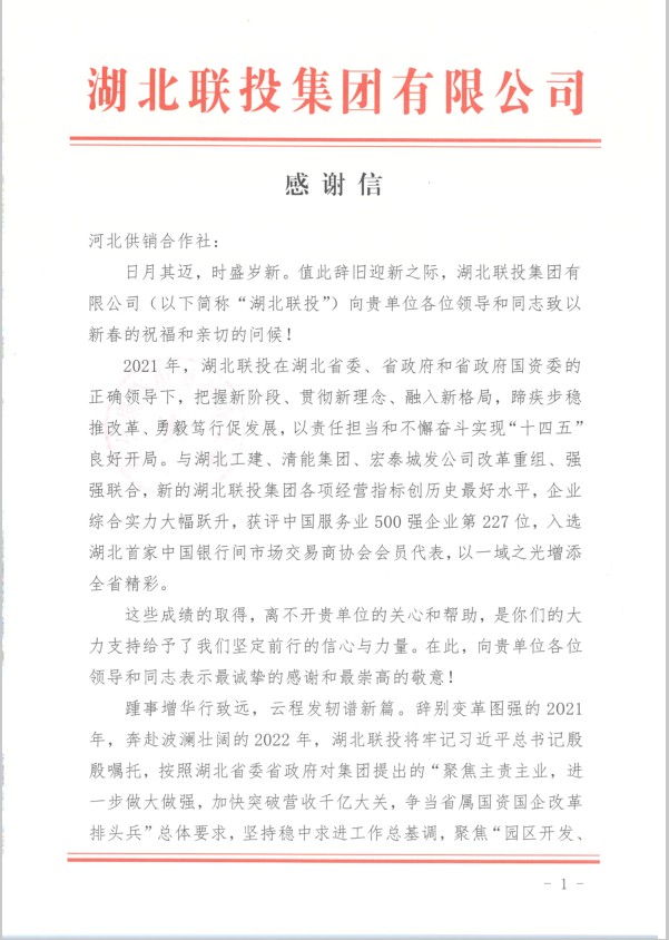 本網訊   1月28日,湖北聯投集團有限公司向河北省供銷合作總社發來感謝信,對雙方良好的合作表示高度贊揚,對河北省供銷社以往的大力支持表示衷心的感謝并致以新春的問候。作為河北省供銷系統龍頭企業,河北省農資集團今后將與湖北聯投集團進一步加強業務合作,拓展合作空間,實現合作項目的量級突破,強強聯手,互利共贏,共同創造新的輝煌。