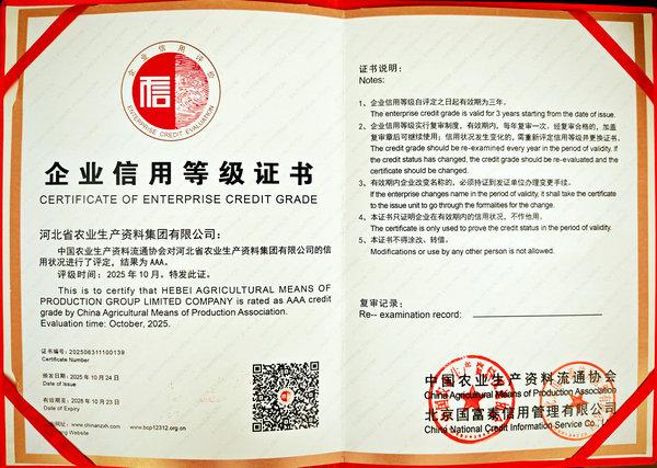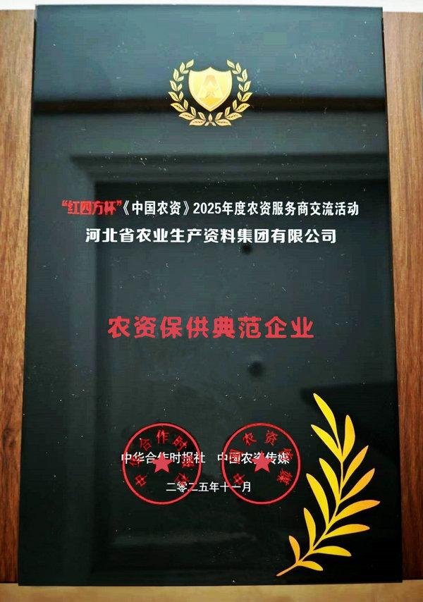 本網訊 11月4日,中國農業生產資料流通協會在江蘇省南京市召開“2025年度中國農資經銷商年會”。會上發布了“2024/2025中國農資流通行業發展報告”,公布了2025年度中國農資流通企業信用等級評價結果、2025年度農資流通企業競爭力評價及農資行業知名品牌認定結果。集團公司被評為“AAA級信用企業”,同時榮獲“2025年度農資流通企業競爭力AAAA級”,“冀農”品牌被評為‘“AAA”級農資行業知名品牌(產品類)。