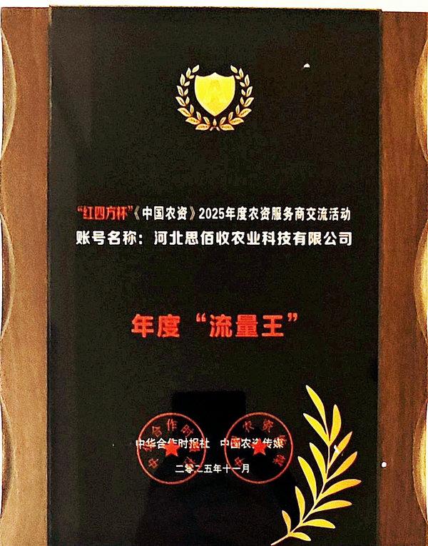 ? 同日,由中華合作時報社、中國農資傳媒主辦的“‘紅四方杯’尋找流量王 ·《中國農資》2025年度農資服務商交流活動暨《國肥之光第二季》”在南京舉行。會上發布了2024-2025年度農資服務商典范企業名單及年度“流量王”名單,集團公司榮獲“農資保供典范企業”榮譽稱號,旗下河北思佰收農業科技有限公司視頻號榮獲年度“流量王”榮譽稱號。