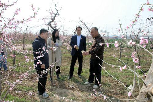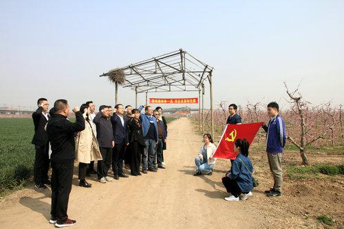 家庭農(nóng)場負(fù)責(zé)人杜永峰為全體黨員現(xiàn)場講解桃樹種植管理技術(shù),并指導(dǎo)黨員參加桃樹點(diǎn)花授粉勞動。